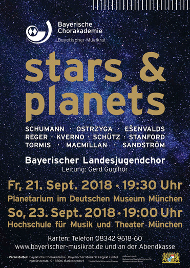 Gerd Guglhör, der Leiter des Bayerischen Landesjugendchores hat vielschichtige Werke der unterschiedlichsten Komponisten zusammengestellt, die sich alle um das eine Thema drehen – das Universum. Die ausgewählten Werke reichen von klangprächtigen Motetten aus dem frühen Barock über Robert Schumanns „An die Sterne“, Max Regers „Das Sternlein“ über James MacMillans Vertonung des Gedichts „Sun Dogs“ bis hin zu „Iuppiter“ des Kölner Komponisten Michael Ostrzyga.