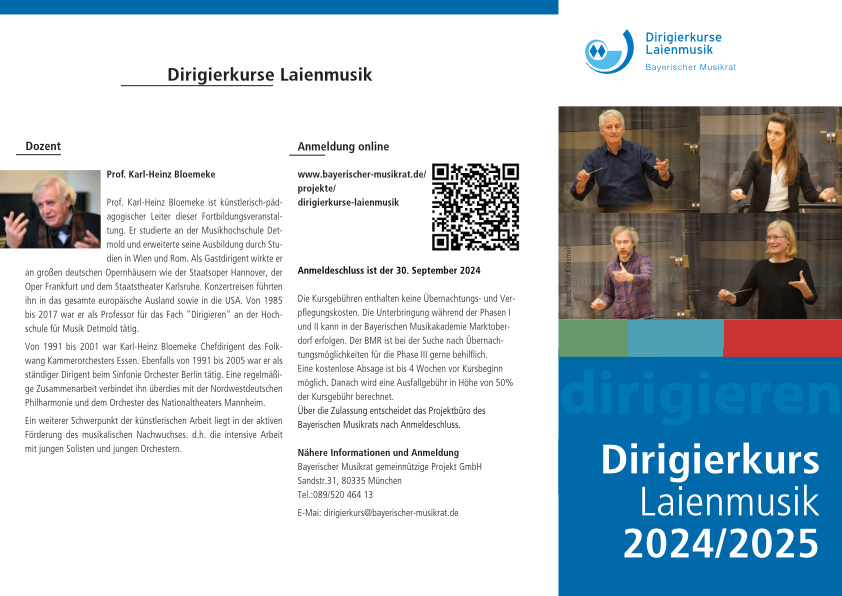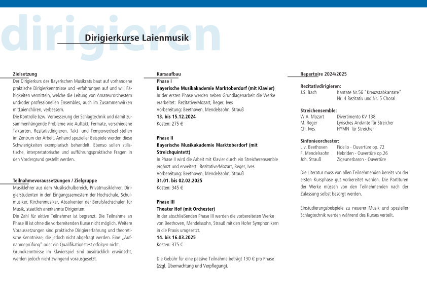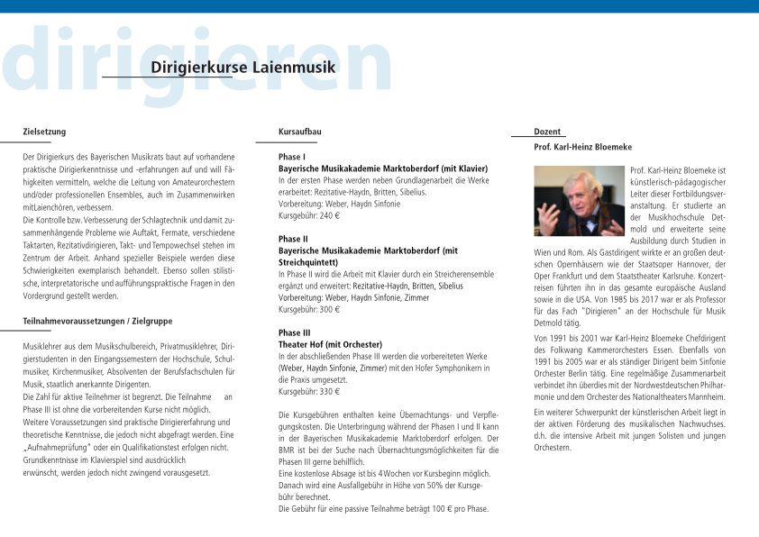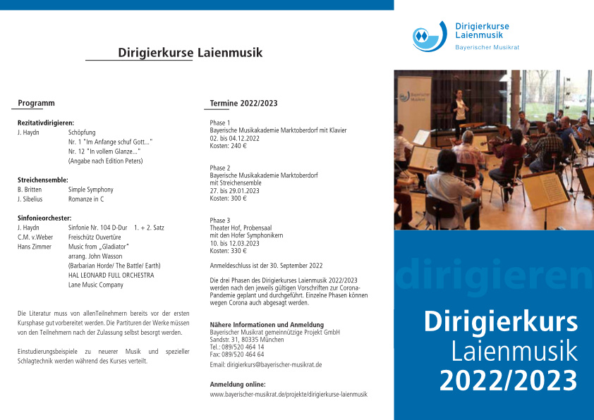 Der Dirigierkurs des Bayerischen Musikrats baut auf vorhandene praktische Dirigierkenntnisse und -erfahrungen auf und will Fähigkeiten vermitteln, welche die Leitung von Amateurorchestern und/oder professionellen Ensembles, auch im Zusammenwirken mit Laienchören, verbessern.
