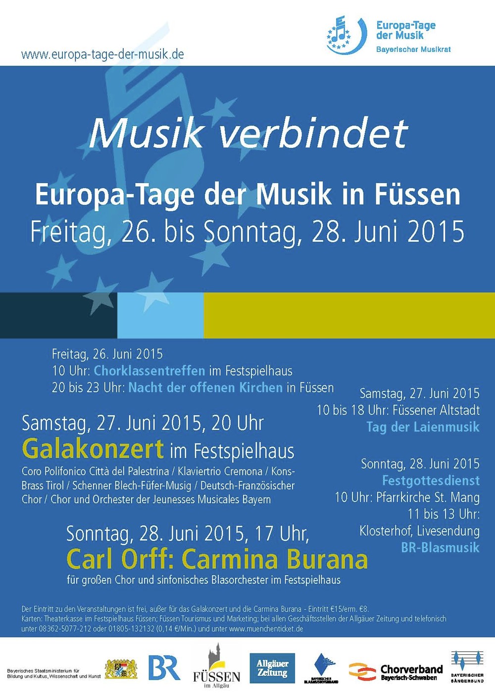 Seit 30 Jahren finden die Europa-Tage der Musik statt, ein Festival für alle: für Musikerinnen und Musiker, für Groß und Klein, für Konzertbesucher und zufällige Gäste. Getreu dem Motto „Musik verbindet“ wird hier der europäische Gedanken vertieft und gepflegt. Die diesjährige Zentralveranstaltung wird vom 26. bis 28. Juni in Füssen gefeiert – ein Fest der Musik und der Begegnung! Mit der romantischen Altstadt, dem Klosterhof und dem Festspielhaus mit Blick auf Schloss Neuschwanstein bietet Füssen das perfekte Ambiente für die Europa-Tage der Musik. „Wir waren überwältigt von dem großen Interesse bayerischer Musikvereine und Chöre – alle wollen in Füssen dabei sein!“, berichtet Organisator Andreas Horber vom Bayerischen Musikrat.
