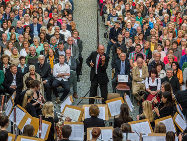 29.06.2015 Die Europa-Tage der Musik feierten 2015 das Festwochenende in Füssen und hinterließen hier "restlose Begeisterung", wie es eine Besucherin am Sonntagabend im Festspielhaus formulierte. 2000 Akteure musizierten an drei Tagen in Füssen und ließen das Motto der Europa-Tage "Musik verbindet" aufleben. "Musik verbündet", ging der Präsident des Bayerischen Musikrats, Dr. Thomas Goppel sogar noch weiter. Zu sehen und zu hören war dies in den zahlreichen Konzerten: am Freitag beim Chorklassentreffen im Festspielhaus mit rund 800 Kindern aus Schwaben und Oberbayern, bei der Nacht der offenen Kirchen, beim Tag der Laienmusik am Samstag mit 600 Musikern aus Bayern, der Bukowina und Italien, Schweiz und Österreich, beim Galakonzert, dem Festgottesdienst, der BR Blasmusik Livesendung aus dem Klosterhof und dem fulminanten Abschluss mit der Carmina Burana für großen Chor und sinfonisches Blasorchester im ausverkauften Festspielhaus.