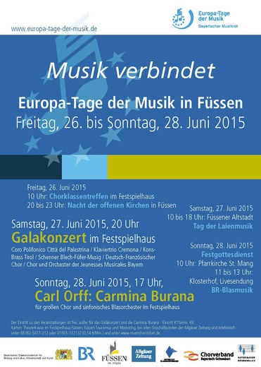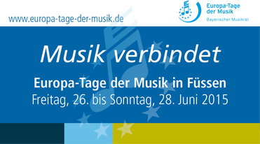 Die diesjährigen „Europa-Tage der Musik“ dauern vom 12. Juni bis 5. Juli 2015. Chöre, Musikvereine und Musizierende aller Musik-Genres sind eingeladen, sich mit Konzerten in ihrer Region oder an der Zentralveranstaltung 2015 in Füssen daran zu beteiligen. Im Rahmen der Zentralveranstaltung 2015 am letzten Juni-Wochenende in Füssen können Chöre, Bläserensembles, Streicher, Zupfer, Bands und weitere Musikformationen ihr Können der Öffentlichkeit präsentieren.