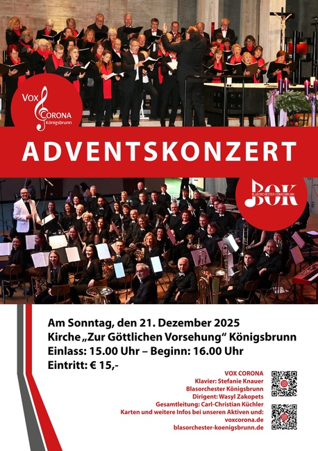 Adventskonzert von Vox Corona Königsbrunn gemeinsam mit dem Blasorchester Königsbrunn mit zeitgenössischen weihnachtlichen Chorsätzen inklusive Klavierbegleitung sowie schwungvollen weihnachtlichen Melodien präsentiert vom Blasorchester.